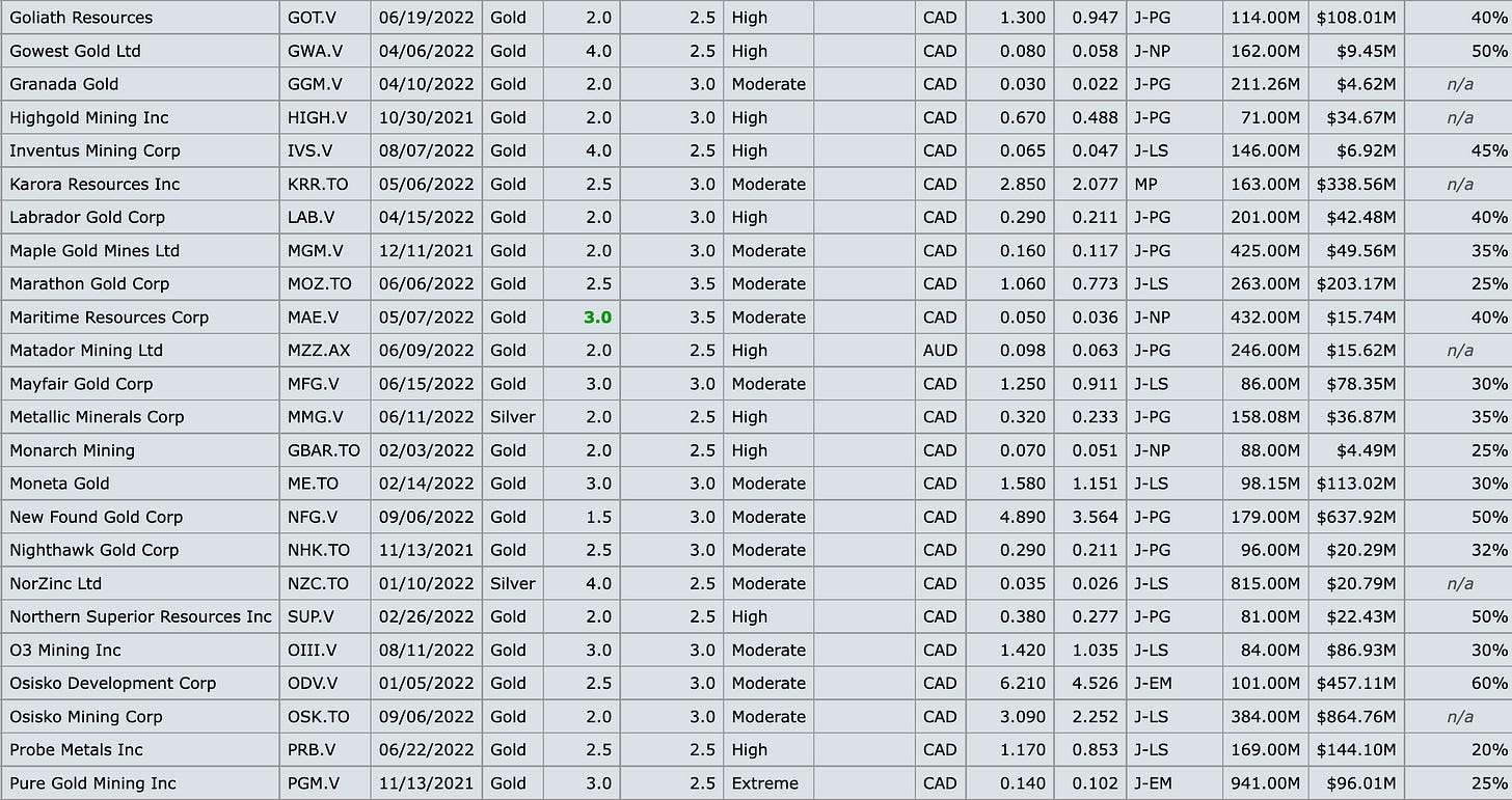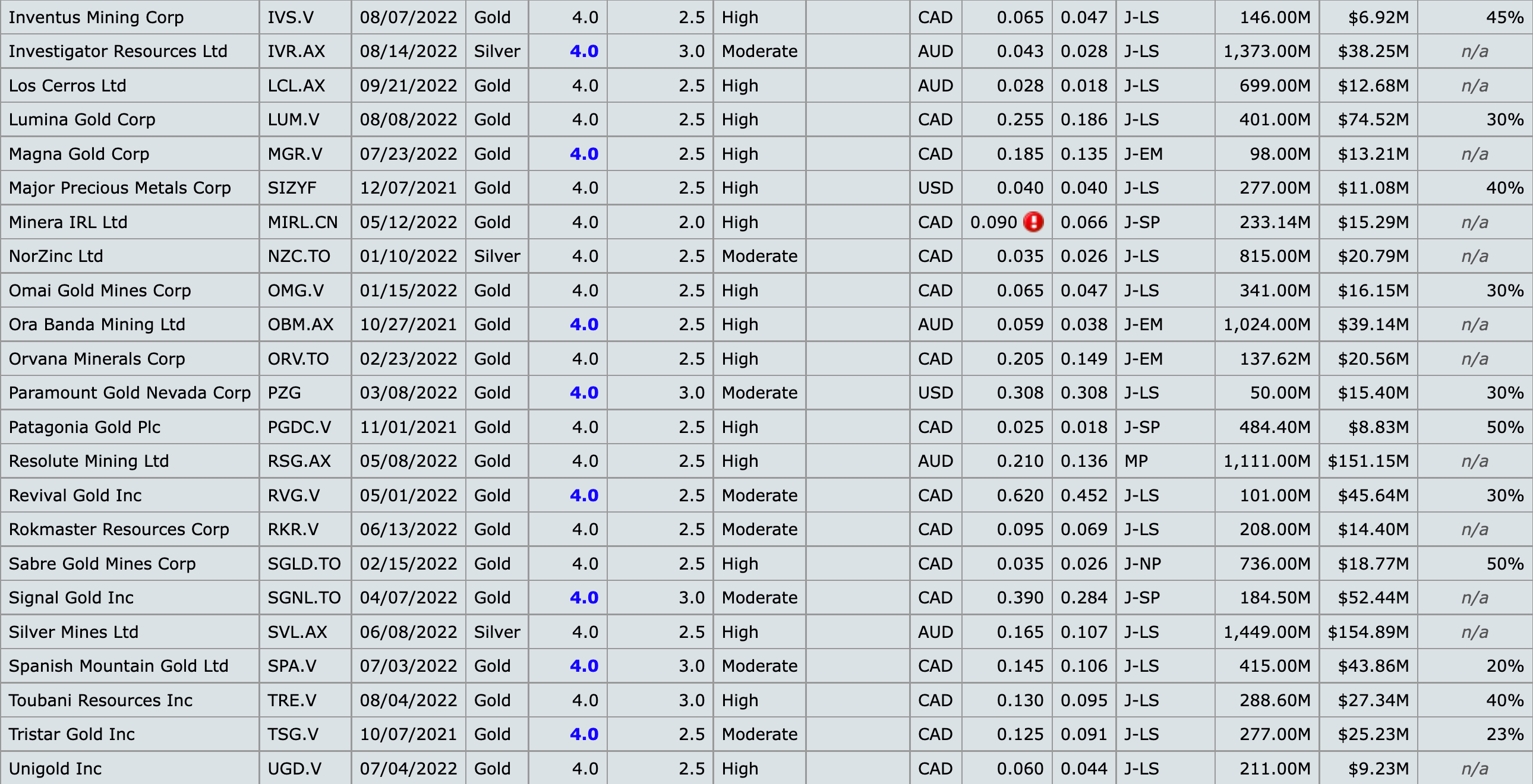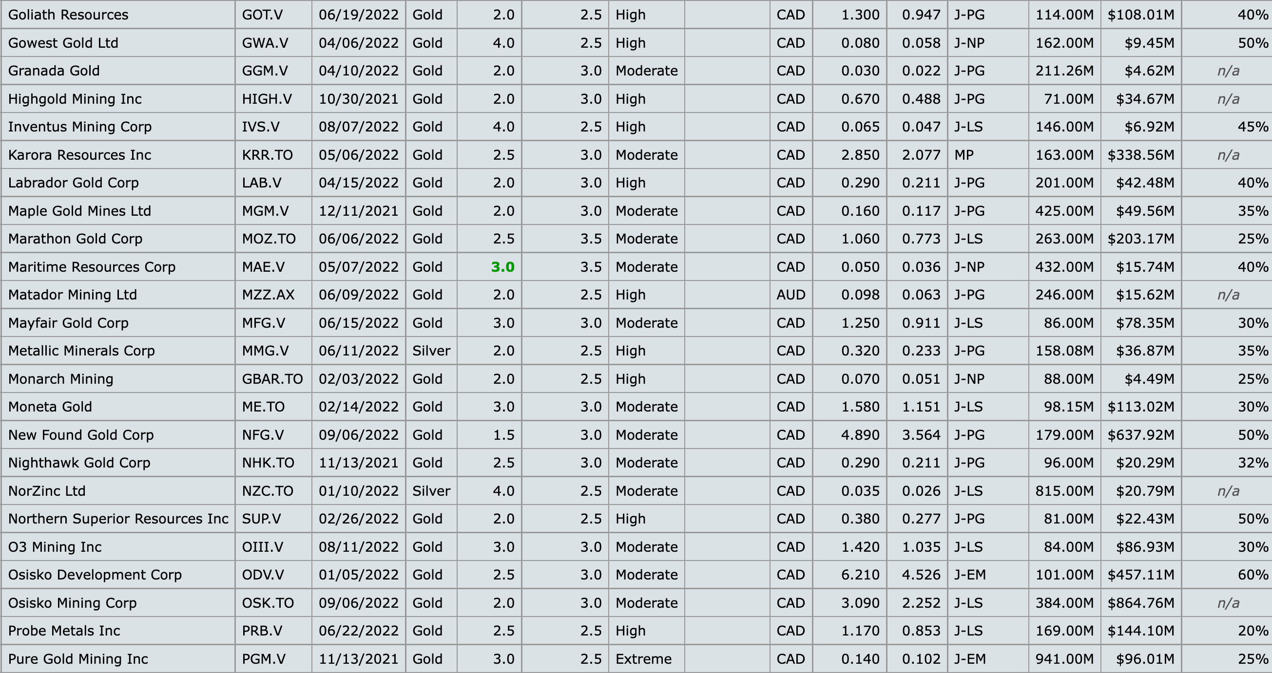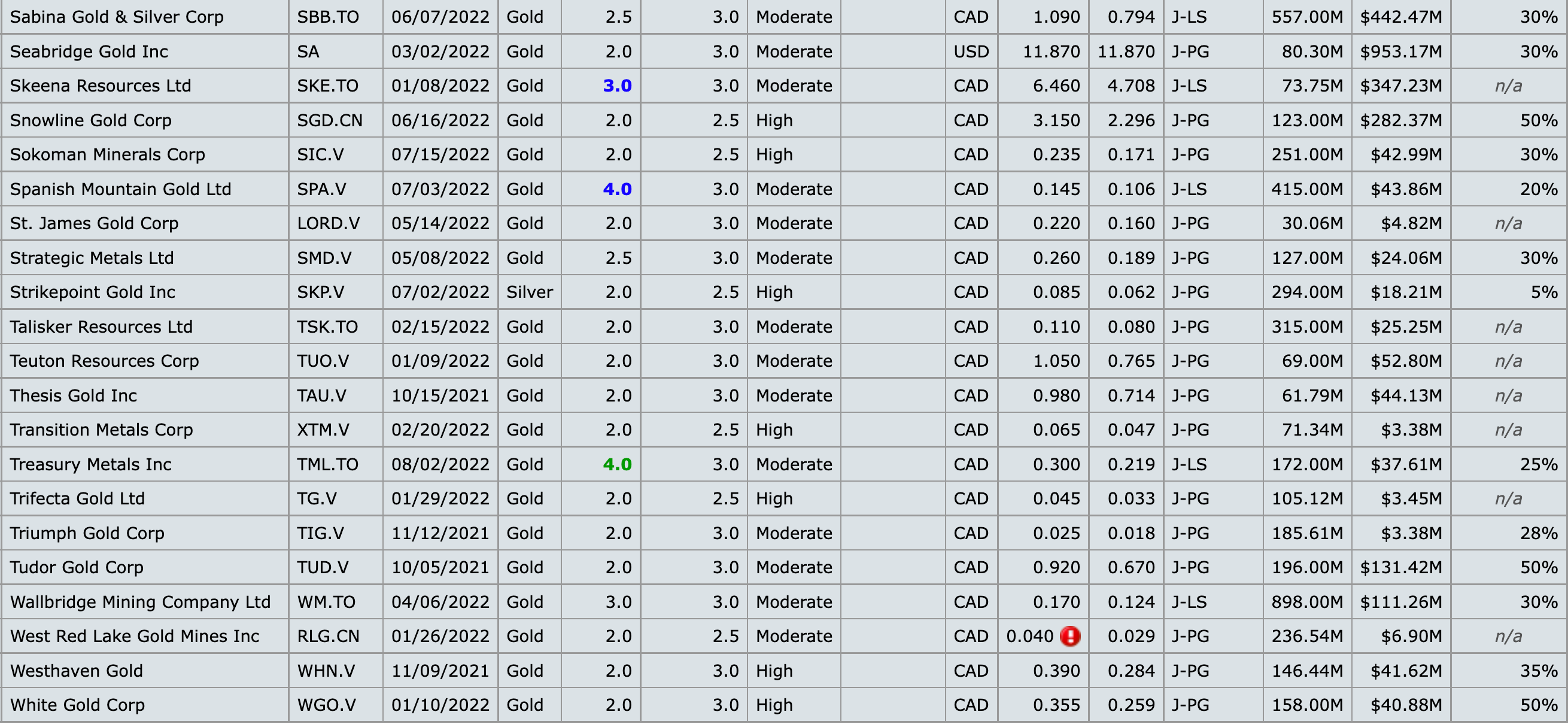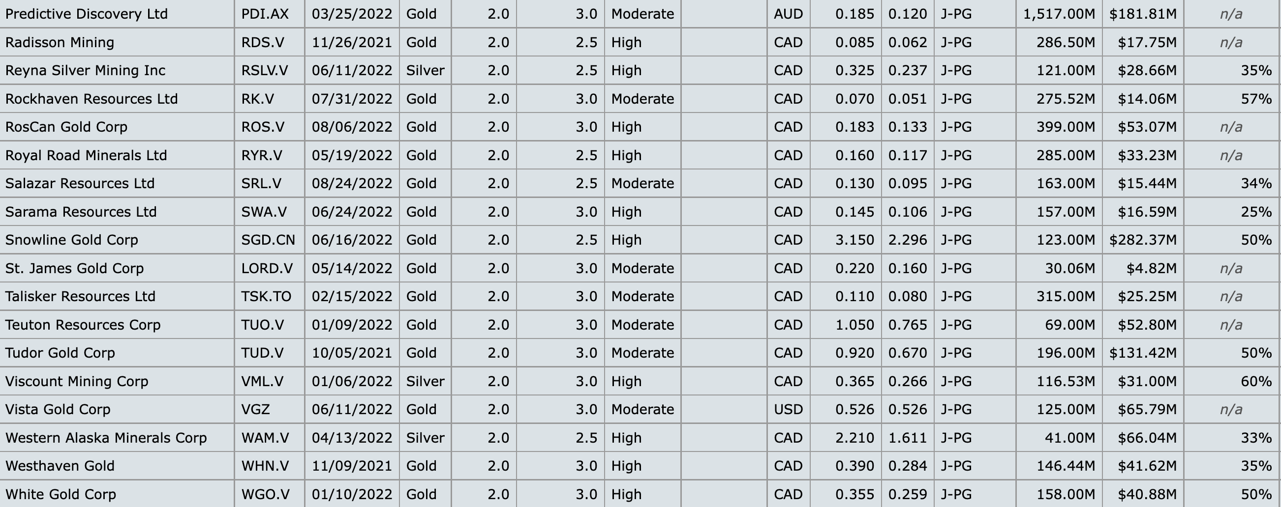 Removed: Snowline, Alien Metals, Goliath Resources, Nevada King, Northern Superior, Aztec (all moved to advanced exploration).