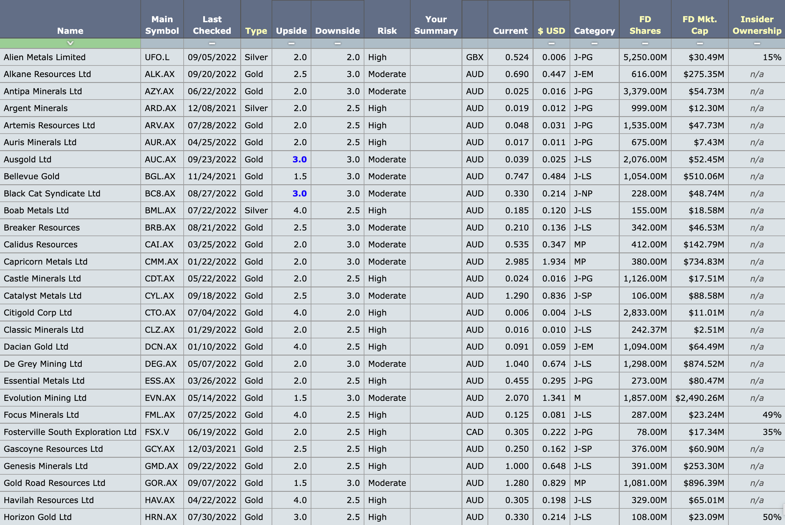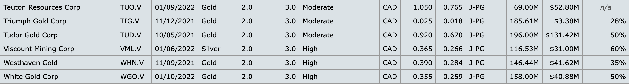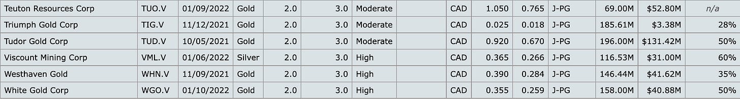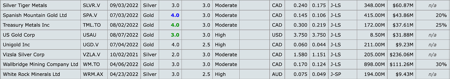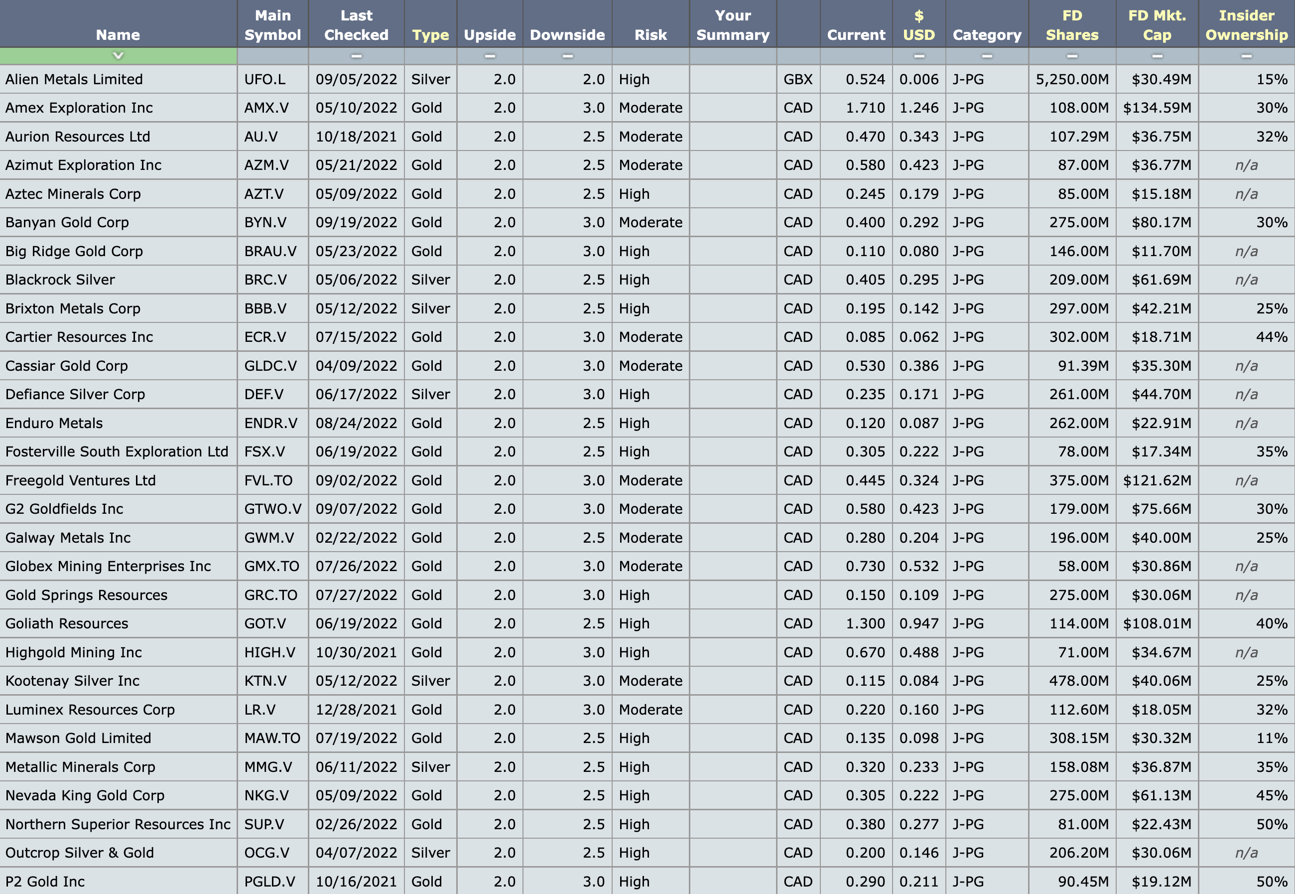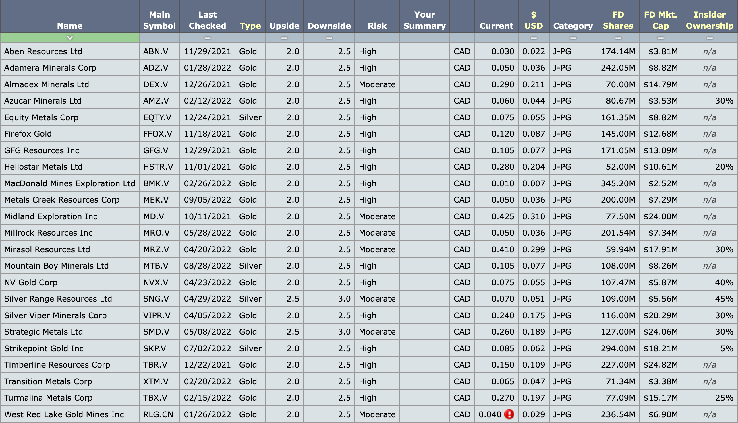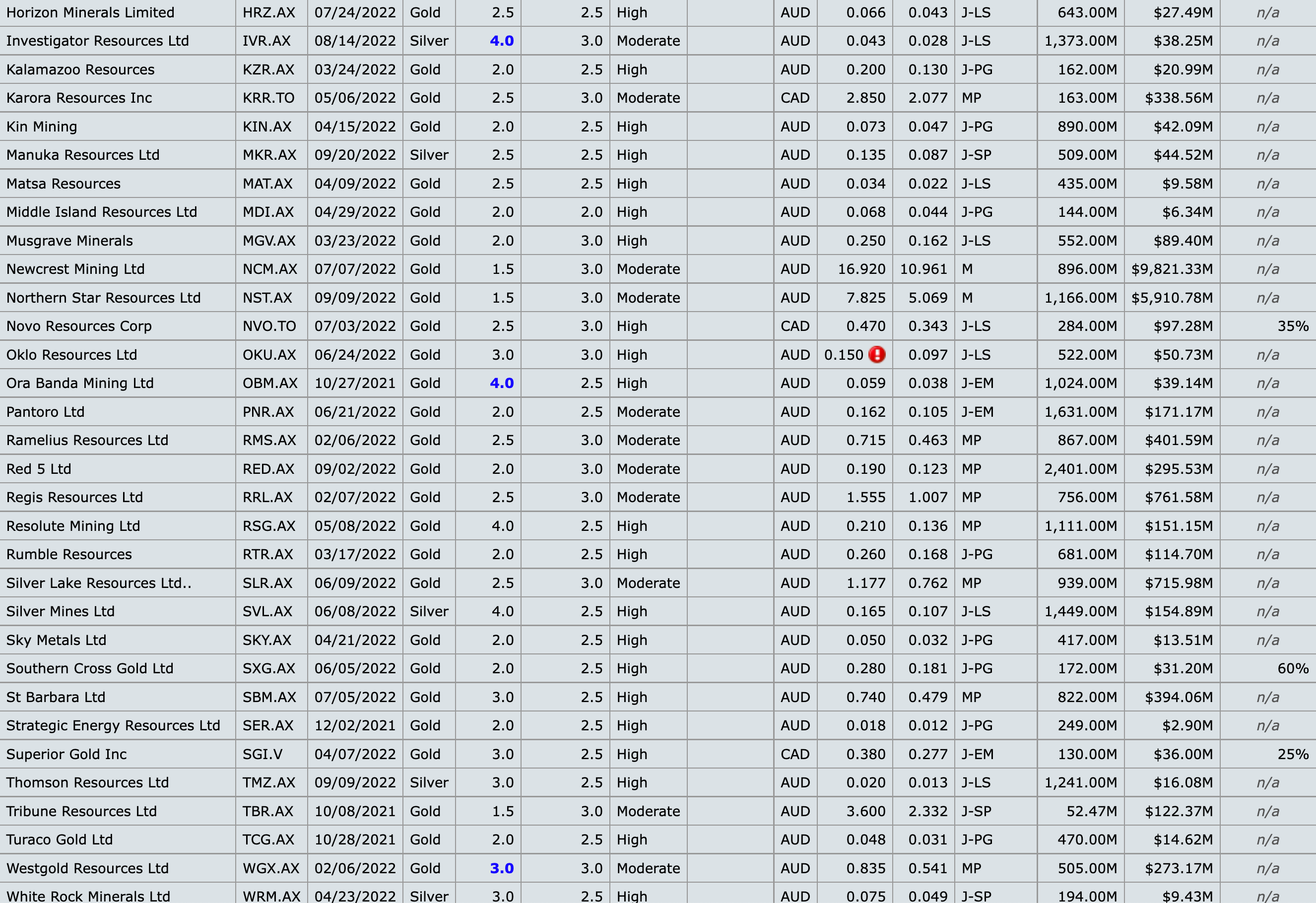 Removed: Snowline, Alien Metals, Goliath Resources, Nevada King, Northern Superior, Aztec (all moved to advanced exploration).