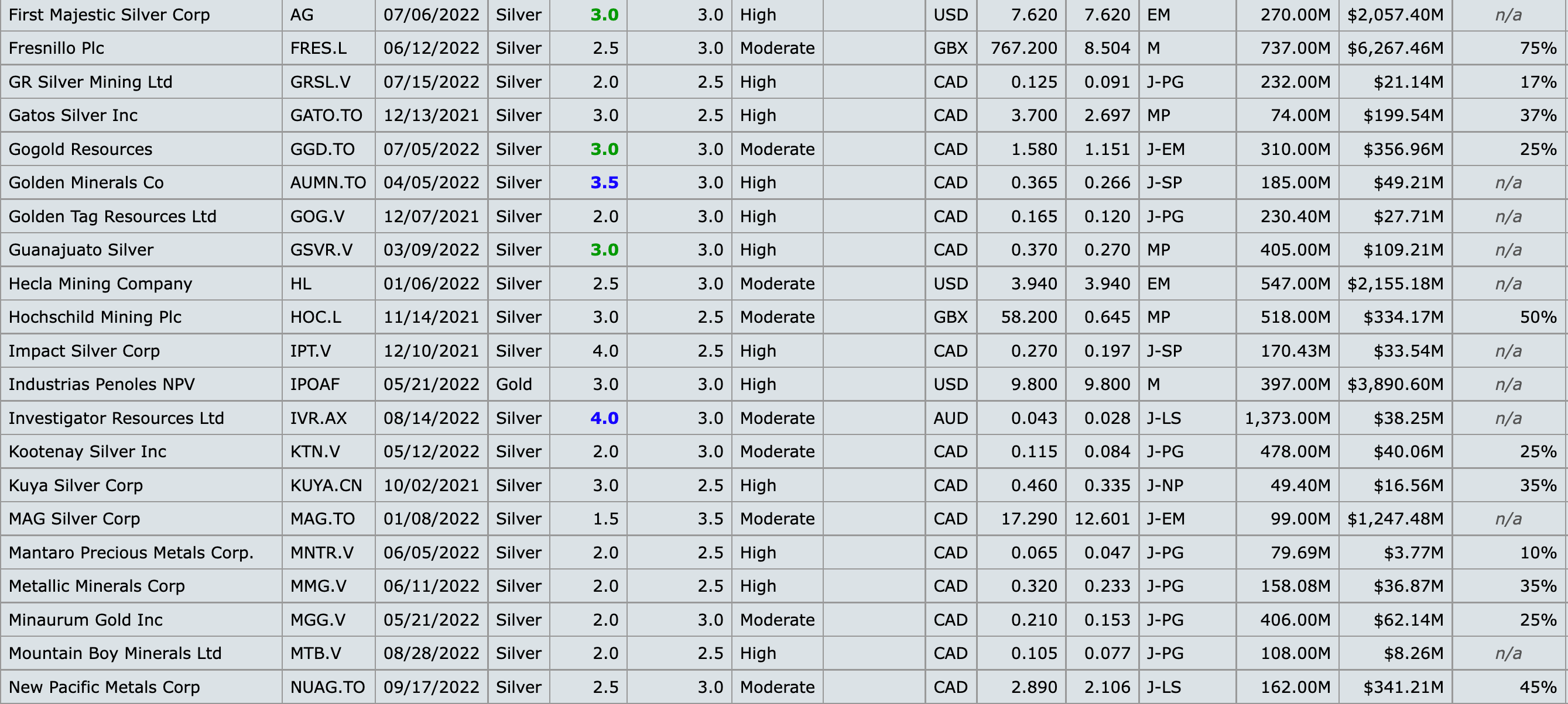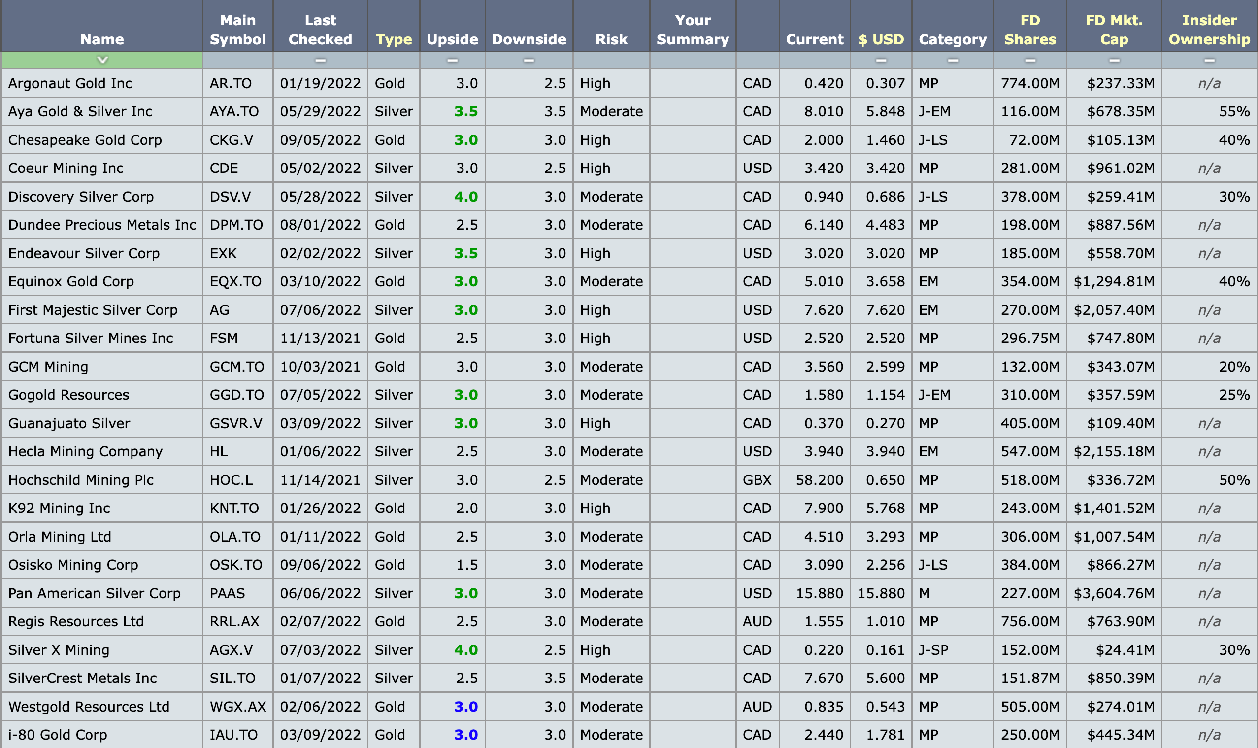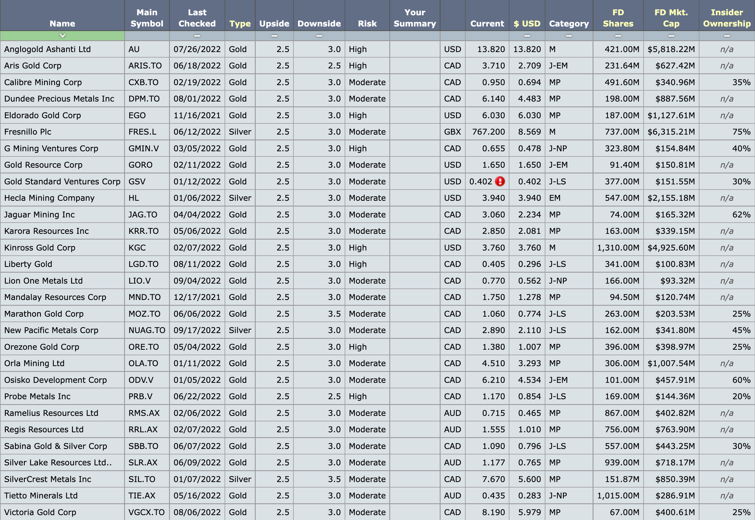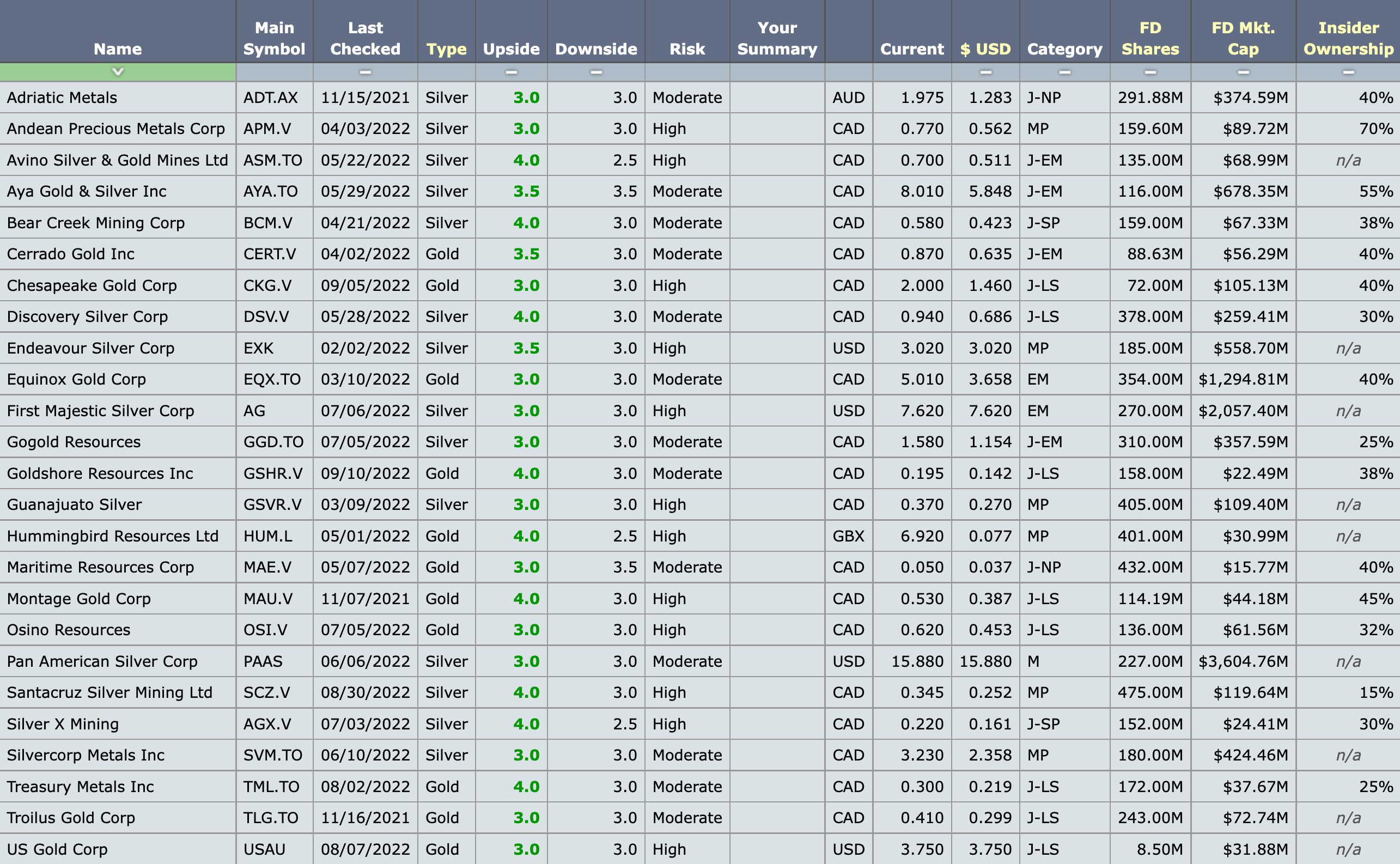 The Top 25 are the best risk/reward stocks at $2500 gold and $100 silver. The Top Picks include stocks that I consider 5+ baggers at $2500 gold and $100 silver, have 3 ratings or higher, and do not have any significant red flags. Significant red flags would include high debt, low cash, financing issues, location issues, growth issues, legal issues, timeline issues, management issues, etc.