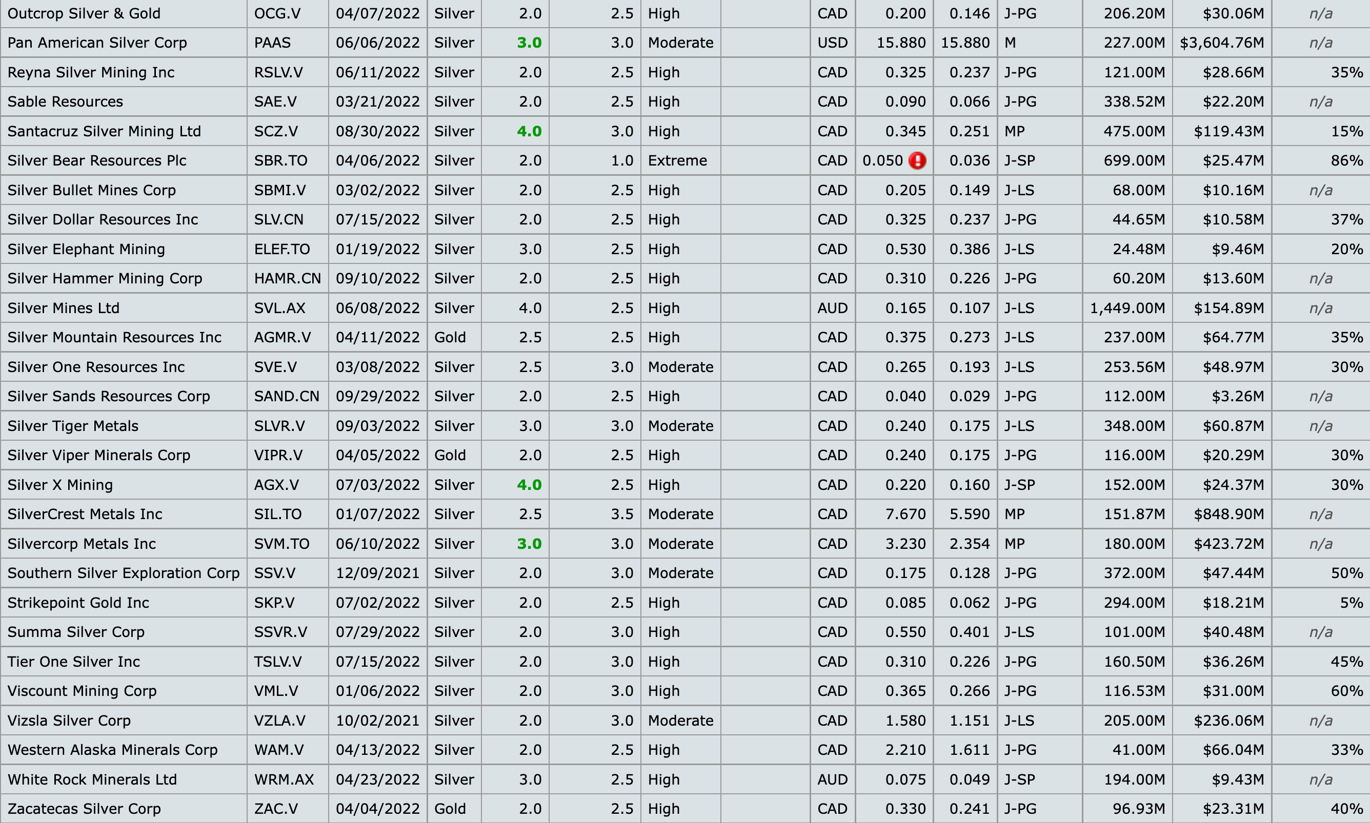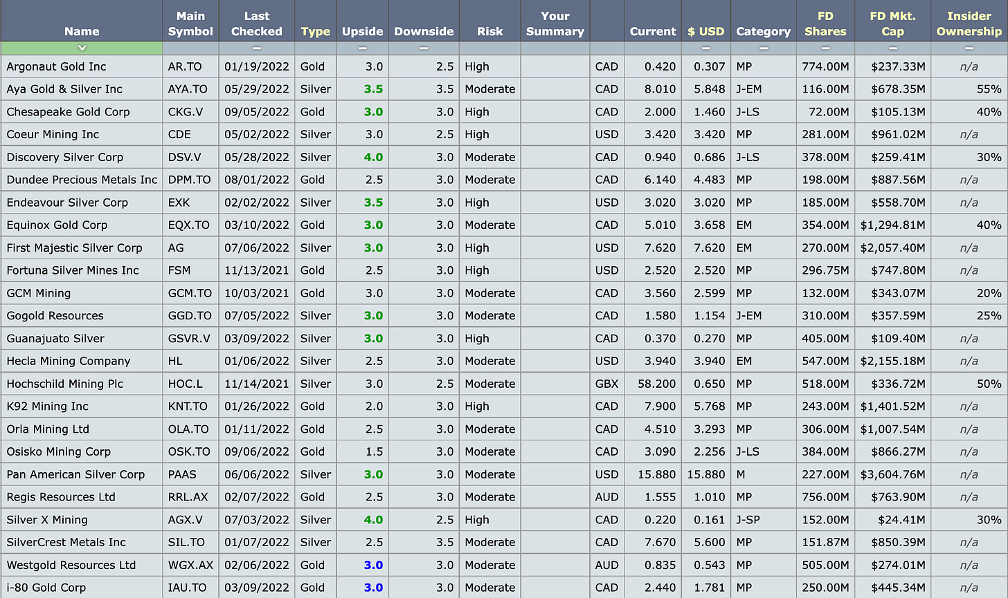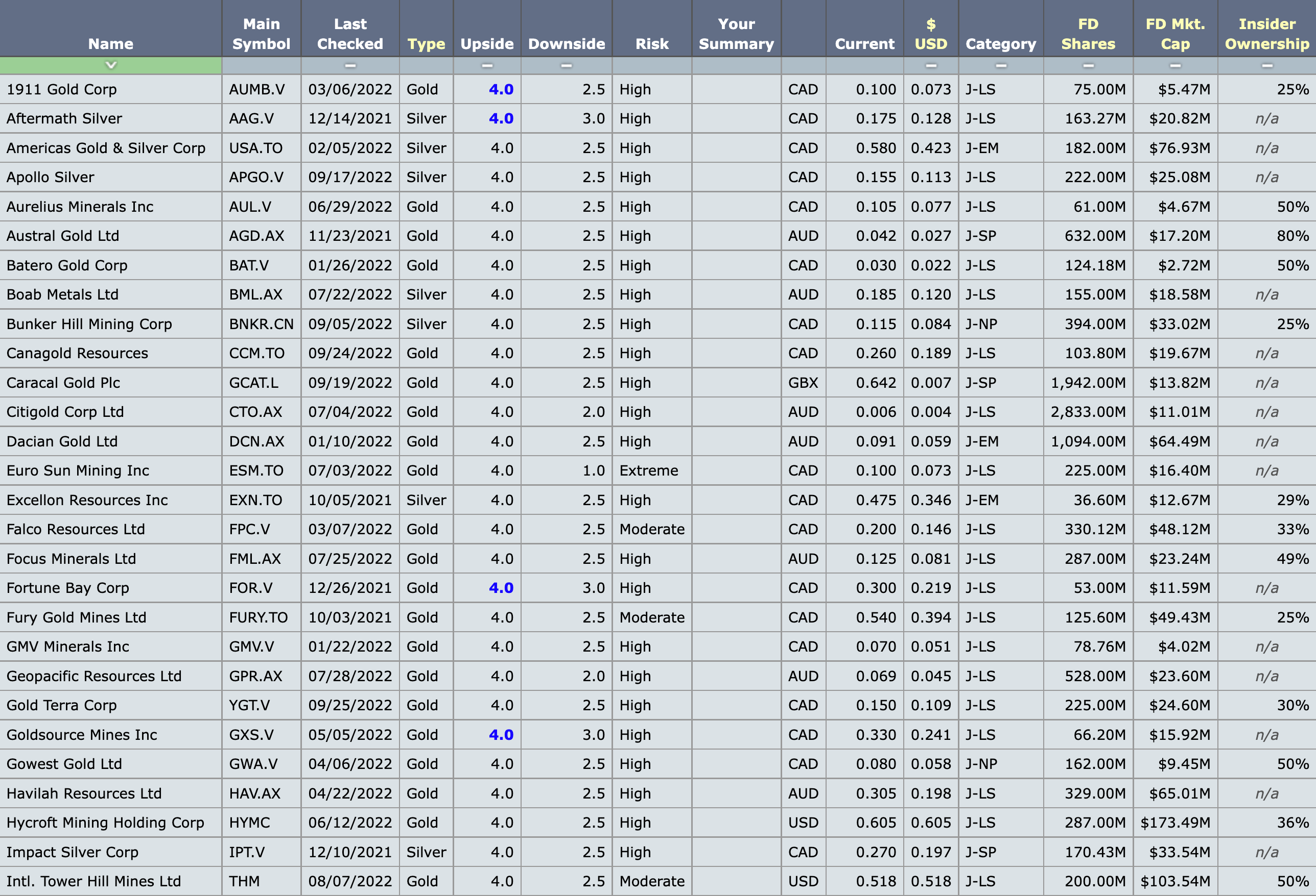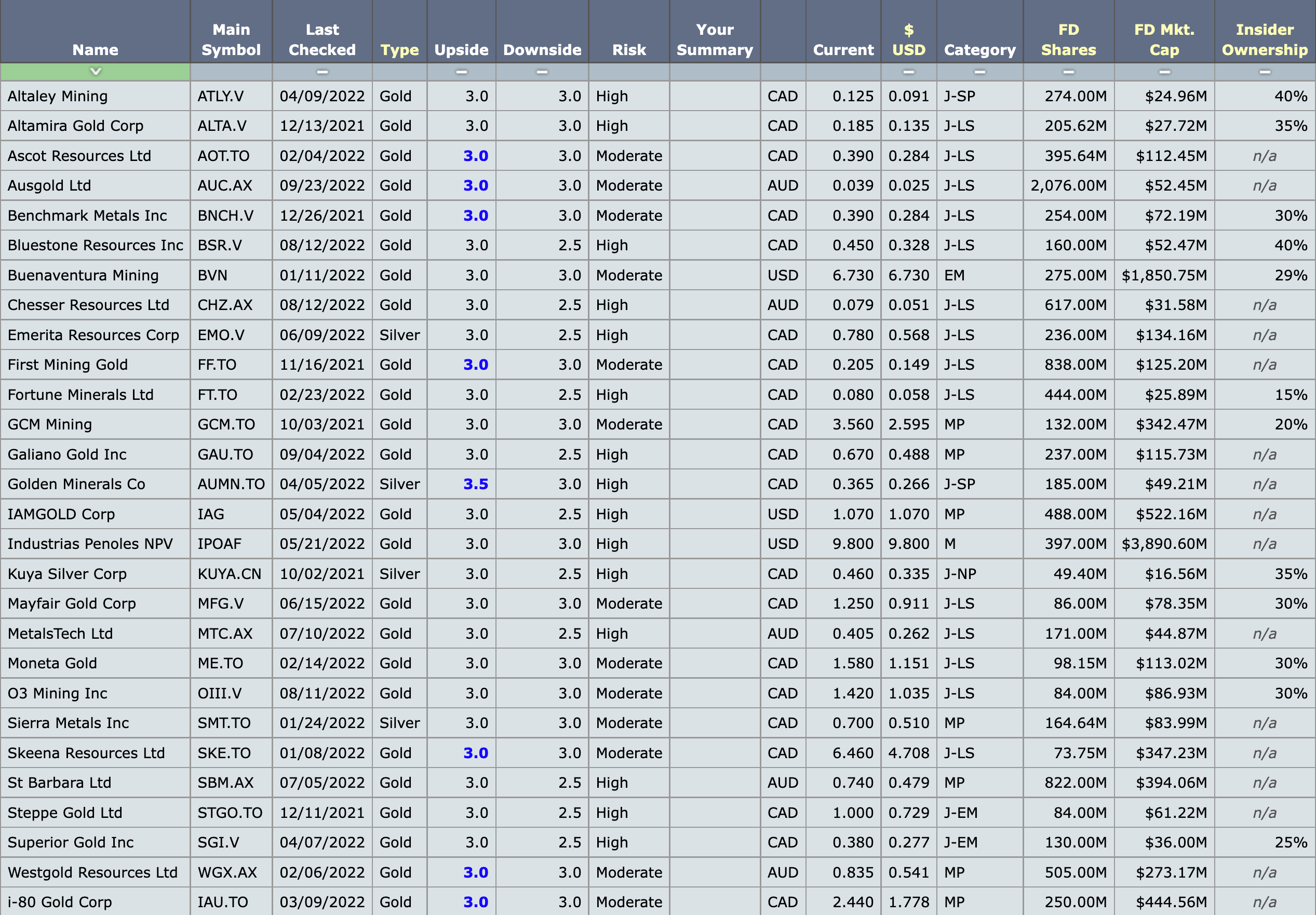 The Top 25 are the best risk/reward stocks at $2500 gold and $100 silver. The Top Picks include stocks that I consider 5+ baggers at $2500 gold and $100 silver, have 3 ratings or higher, and do not have any significant red flags. Significant red flags would include high debt, low cash, financing issues, location issues, growth issues, legal issues, timeline issues, management issues, etc.