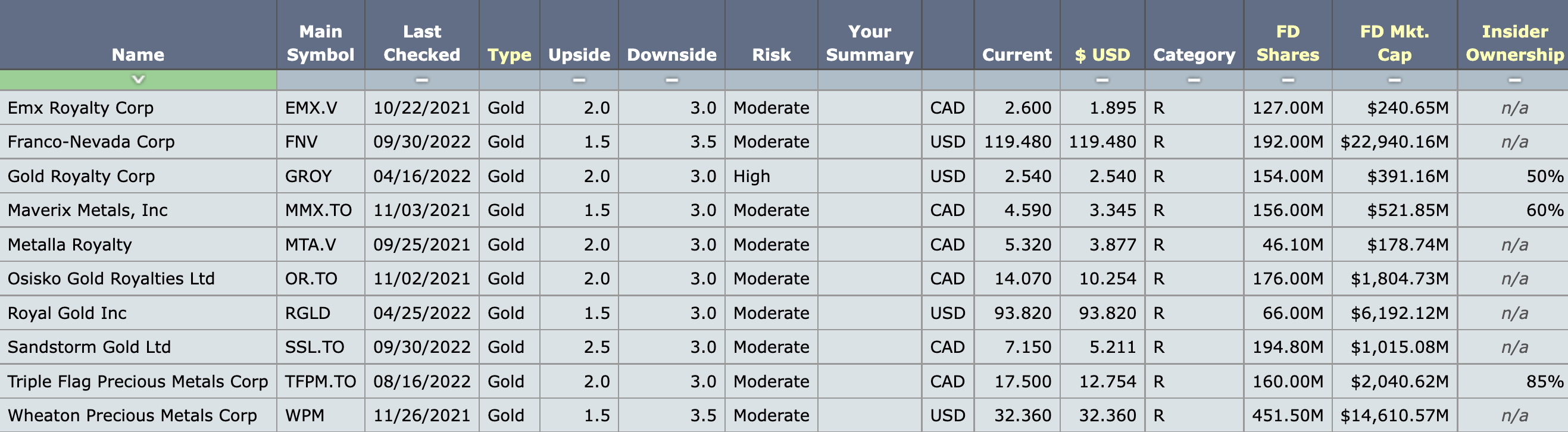 List of high quality producers and royalty stocks. Some of them have high risk, but they all have quality management teams and quality properties. Most are good dividend stocks.