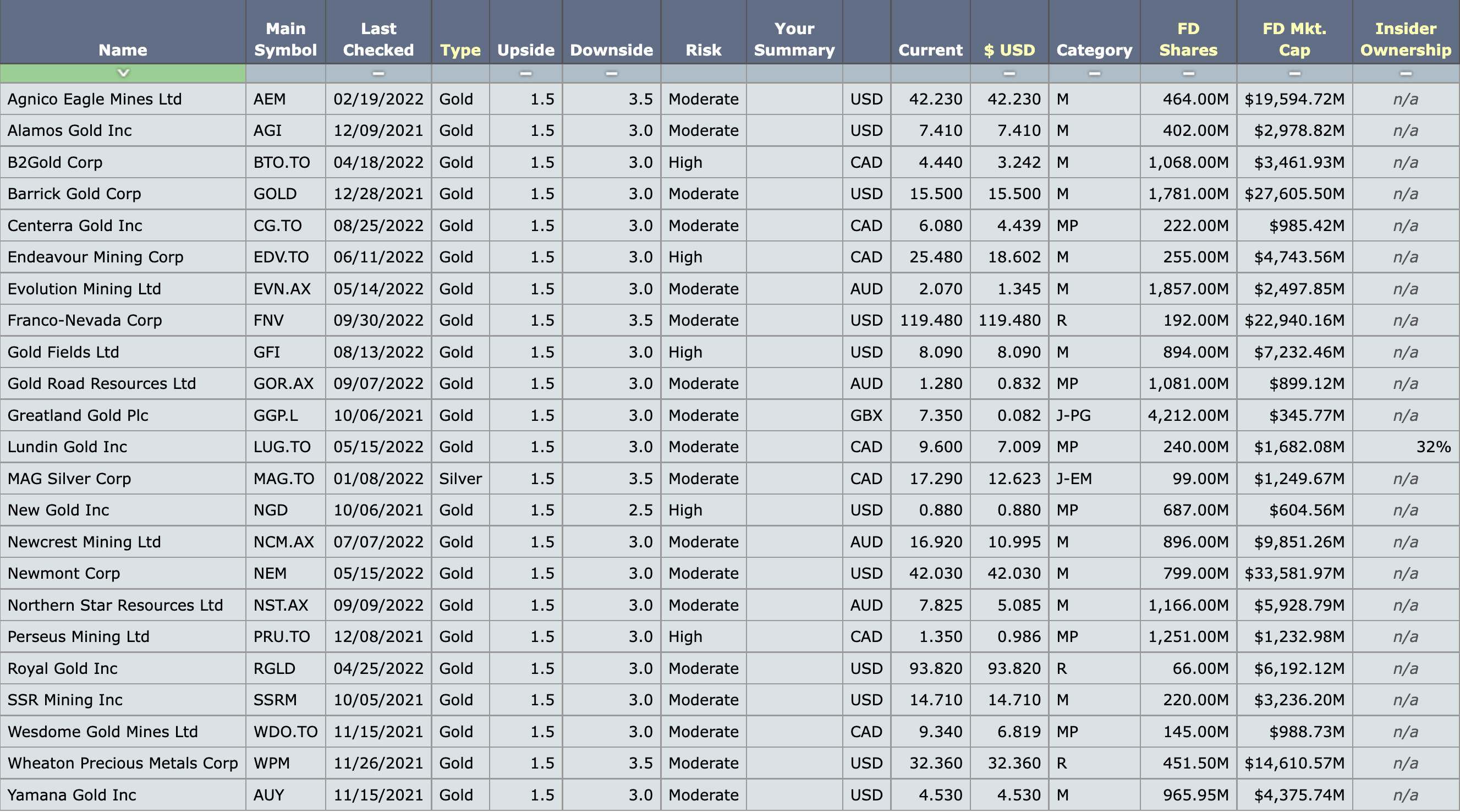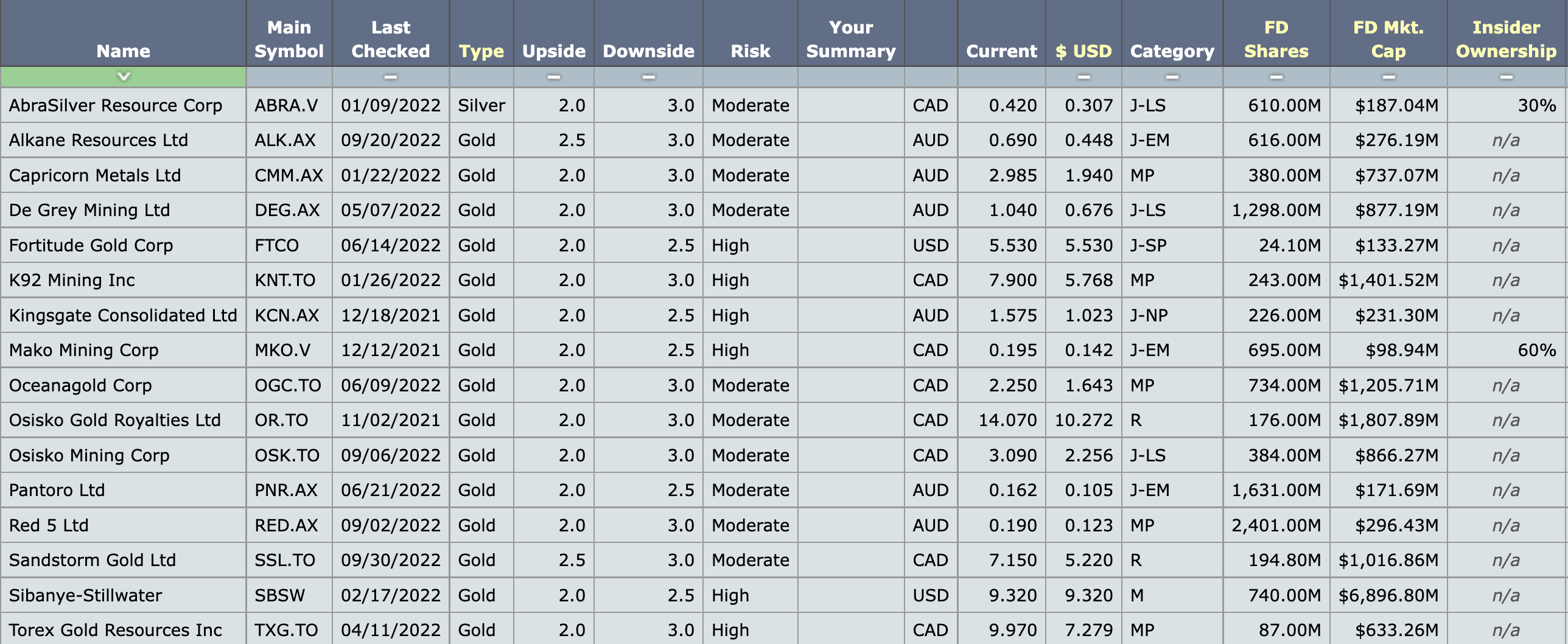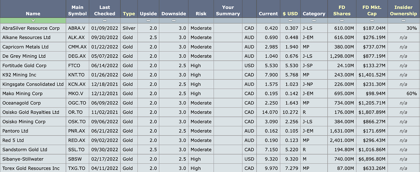 List of quality stocks with moderate expected returns. These are mostly producers or near-term producers, with a few development stocks.