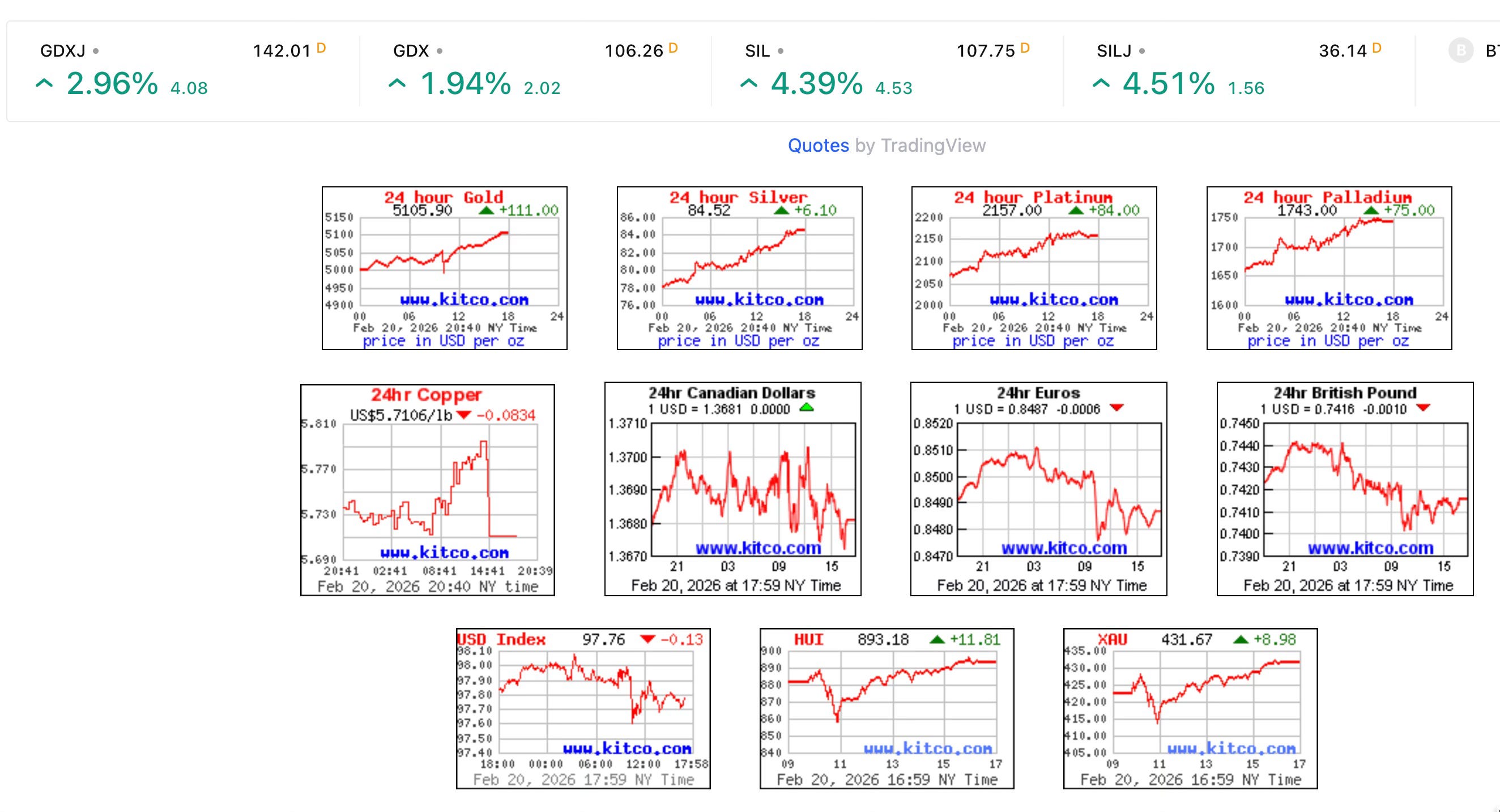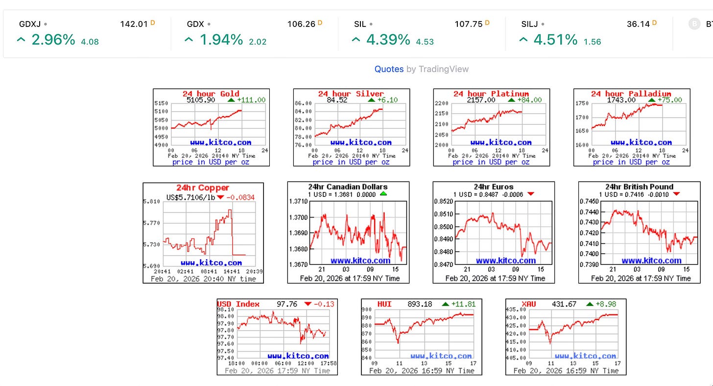 The stock market was happy with the ruling (many companies got a reprieve) and closed the week near an ATH. Gold was also happy. Gold likes uncertainty, which this ruling created. Plus, gold likes a higher stock market. Lil Sis (silver) followed her Big Brother (gold) higher. Gold closed the week above $5100 and silver above $80. While those are strong levels, expect more volatility. If the stock market has any weakness in the near term (likely), gold and silver will likely get smacked.